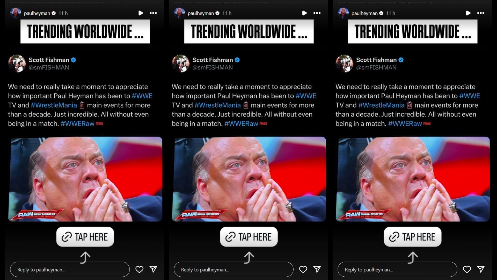 Earlier today, Paul Heyman took to his Instagram stories to reshare wrestling journalist Scott Fishman's X post that praised him for his impressive performances over the years. The WWE Hall of Famer noted he was trending worldwide.