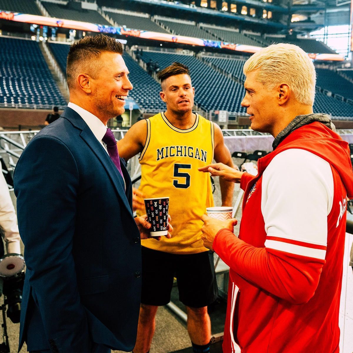 The company shared an incredible behind-the-scenes photo of The Miz and Rhodes having a moment featuring Grayson Waller with them.
