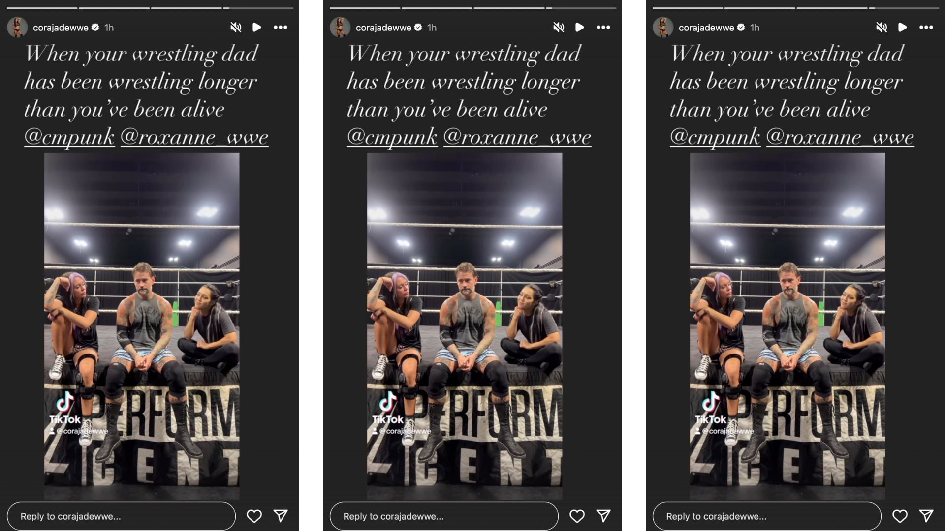 Cora Jade called Punk her wrestling dad on her Instagram story today and noted that he has been wrestling longer than she has been alive. She shared an image of herself with Punk and NXT Women's Champion Roxanne Perez as well.