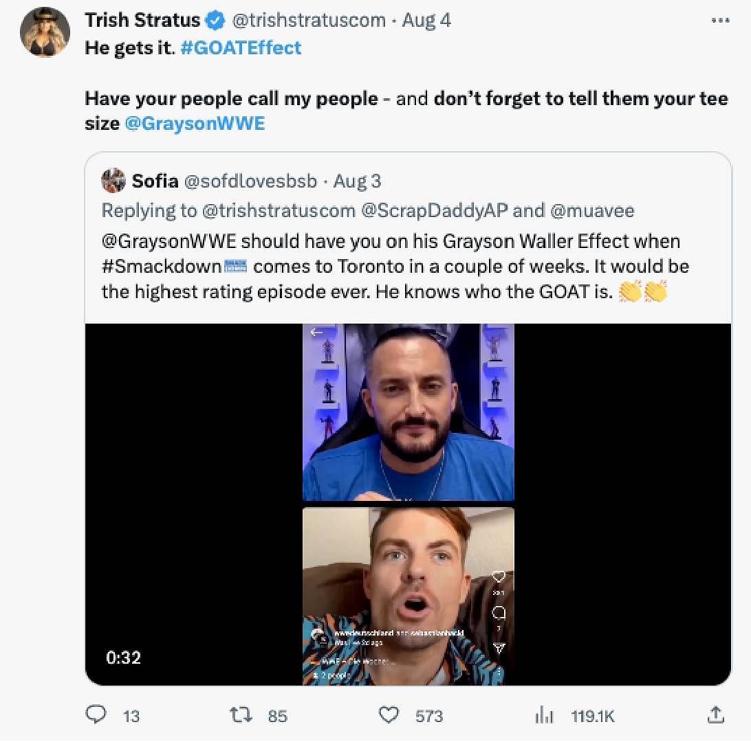 "He gets it. #GOATEffect Have your people call my people - and don’t forget to tell them your tee size @GraysonWWE," wrote Stratus.