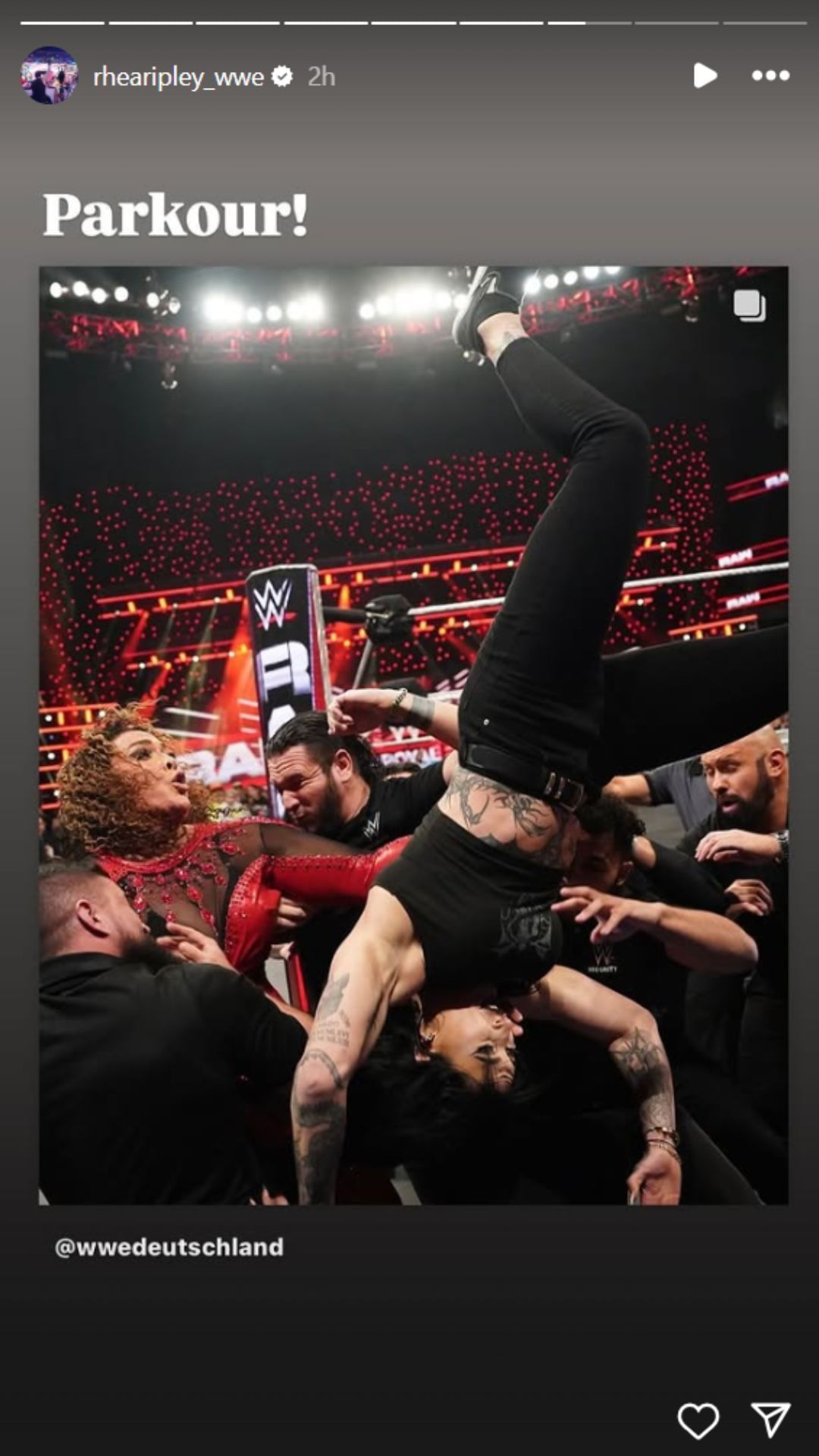 Earlier today, Ripley shared her reaction to jumping off the announcer's desk to take out Nia Jax. The Women's World Champion reshared a post about the brawl while addressing her high-flying maneuver with a one-word message.