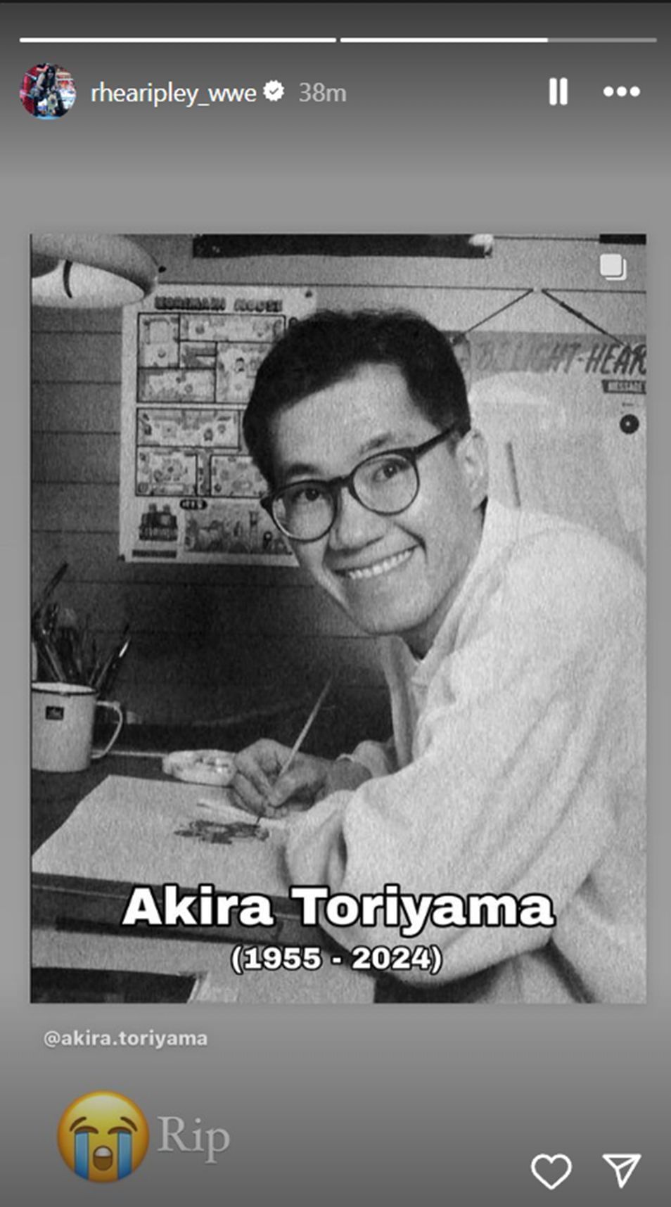 Ripley shared a crying emoji alongside the picture of the former Manga artist and the words RIP.
