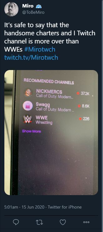 The former US Champion posted a photo on Twitter that showed the live viewership figures of WWE's Twitch channel, which hosted the Backlash Watch Along party with various Superstars and personalities.