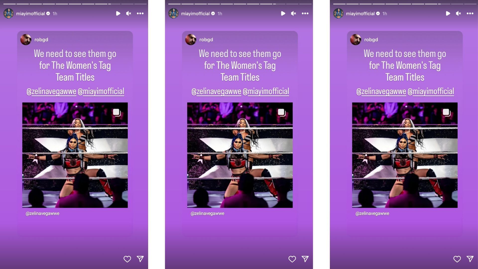 Mia Yim took to her Instagram story today to repost a message from a wrestling fan. The fan claimed that they wanted to see Yim and Vega challenge for the Women's Tag Team Championship, as seen in the image below.