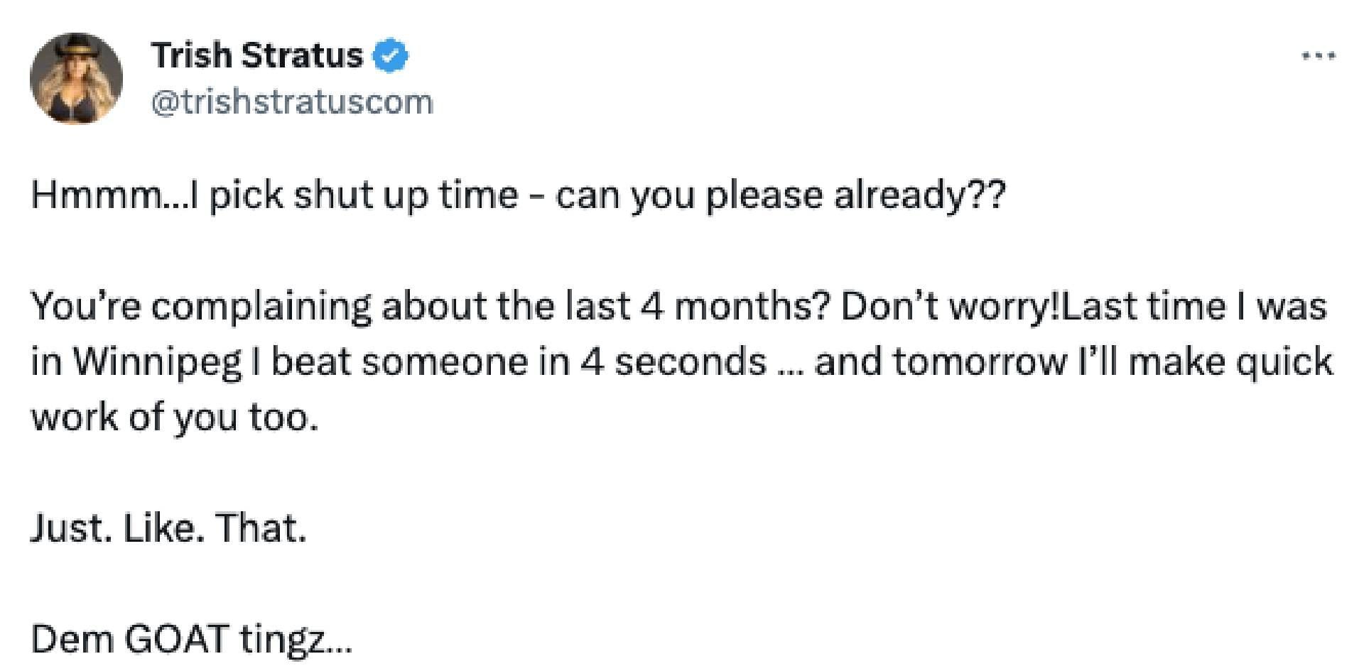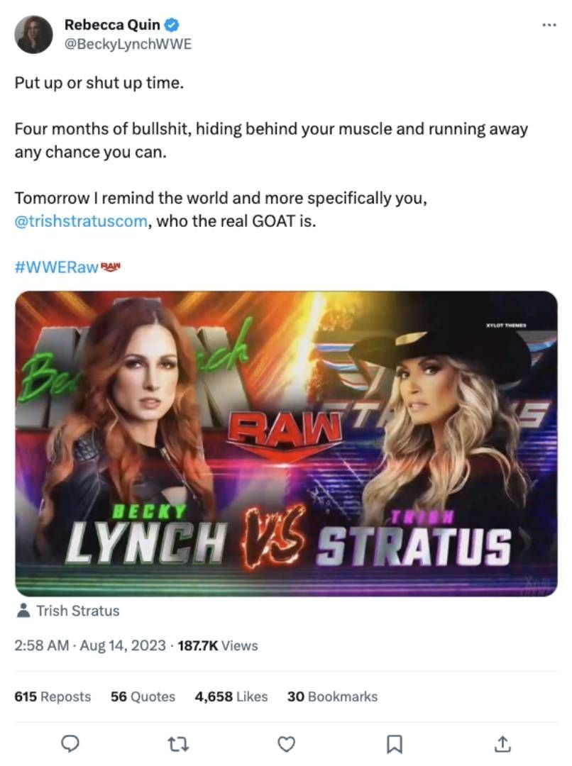 In her tweet, Lynch mentioned that Trish Stratus won't be able to run and hide behind Zoey Stark since she is banned from ringside. Lynch also stated that she was ready to end "four months of bullsh**" and wanted to remind everyone who the real GOAT was.