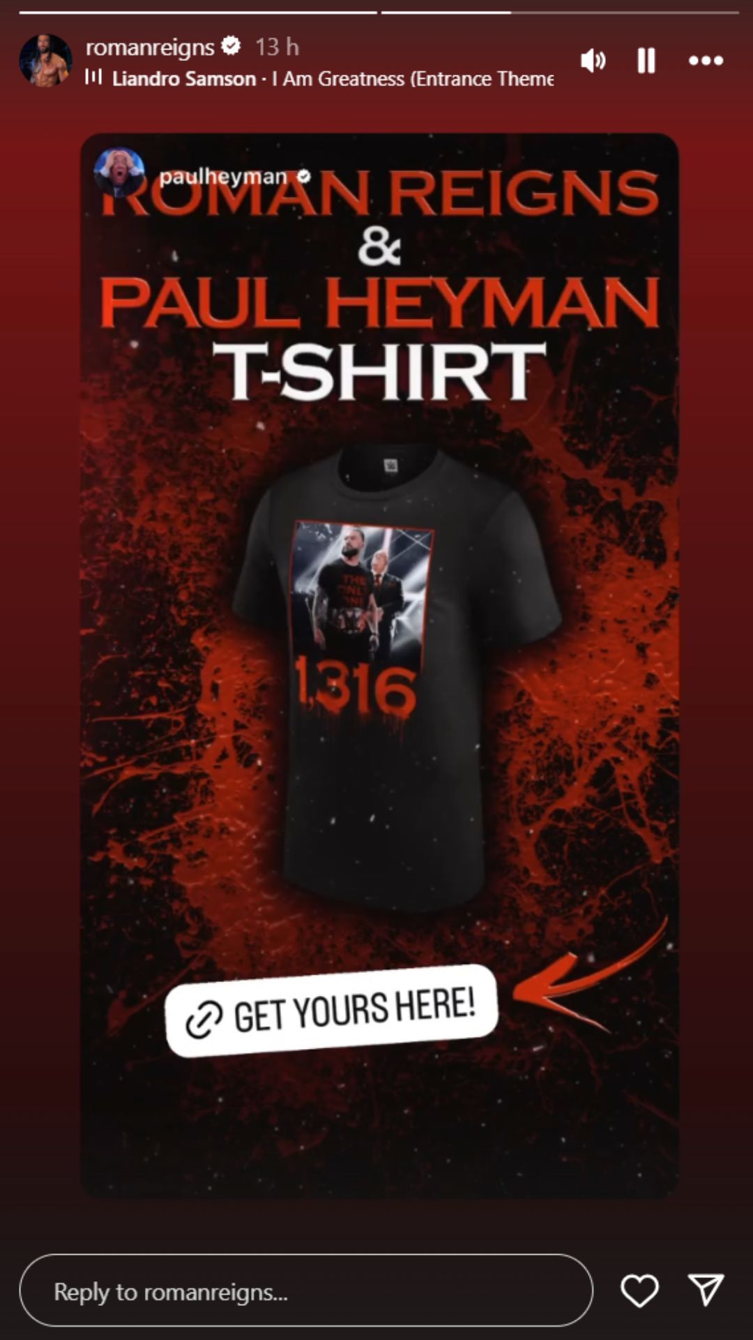 Following The Wiseman's return to television, the global juggernaut released new merchandise to reaffirm Heyman's allegiance with The OTC. The veteran took to his Instagram Stories to advertise the newly launched 'Paul Heyman & Roman Reigns T-shirt.' The former Undisputed WWE Champion also reshared Heyman's Instagram Story.