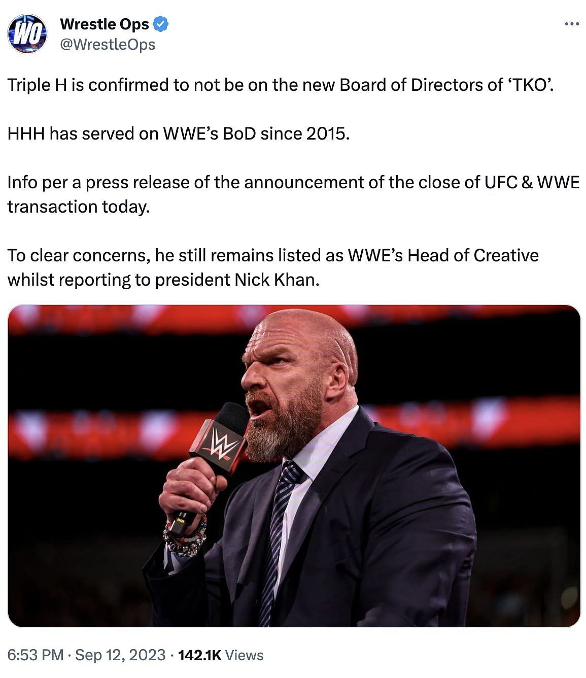 WWE confirmed that the 14-time World Champion Triple H would not be on the new Board of Directors of 'TKO.'