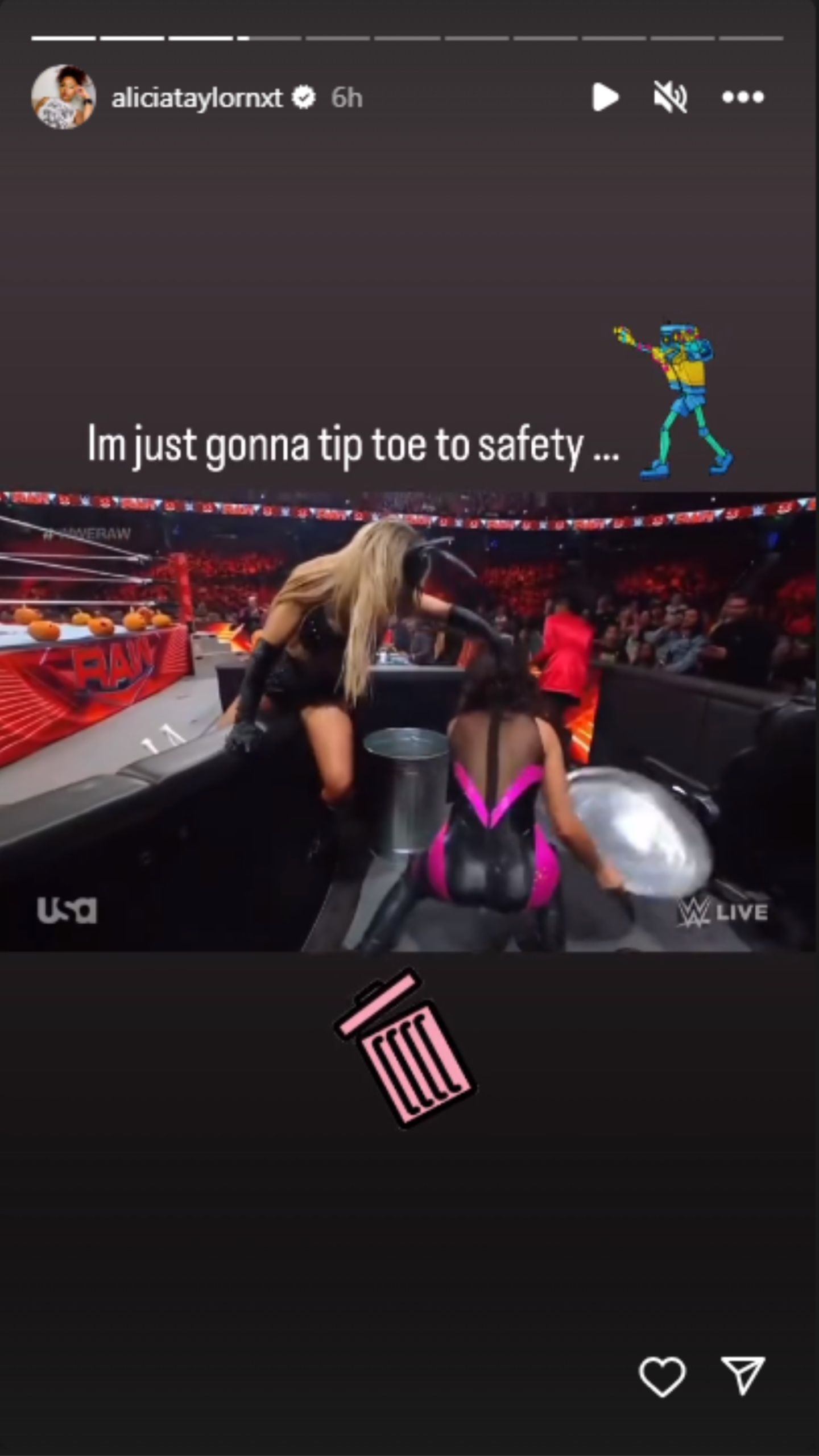The match between the two superstars spilled outside the ring, with Green using a trashcan to incapacitate Natalya. As the violence escalated, Alicia Taylor quietly avoided getting brought into it and was caught on camera. She shared the video on her Instagram story captioned.