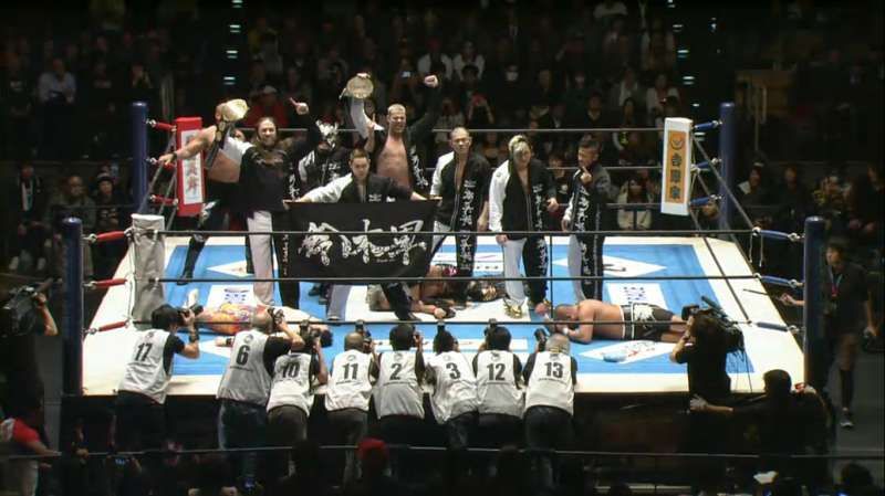 Robinson holds up the NEVER Openweight title after the match as Men in white and black uniforms hit the ring from the crowd. It’s Suzuki-Gun! They take out everyone in sight before Okada tried to mount a fightback. Suzuki-Gun leader Minro Suzuki strolled up from behind Okada and hithim with a Gotch Piledriver after chokinghim out. Suzuki-Gun then lay the boot to CHAOS before Suzuki picked up the IWGP Heavyweight Championship.