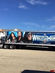Below is a photo of WWE production truck with a WrestleMania 31 poster on it which features The Undertaker along with Roman Reigns & current Divas Champion AJ Lee: