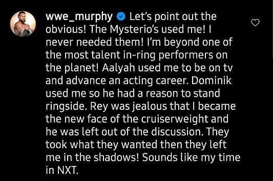 In his Instagram post, Murphy stated that Rey Mysterio and his children had "used" him. He accused Mysterio of being jealous of him because he had become the new face of the cruiserweights in WWE. Murphy's kayfabe post did not sit well with WWE and he was eventually asked to delete it.