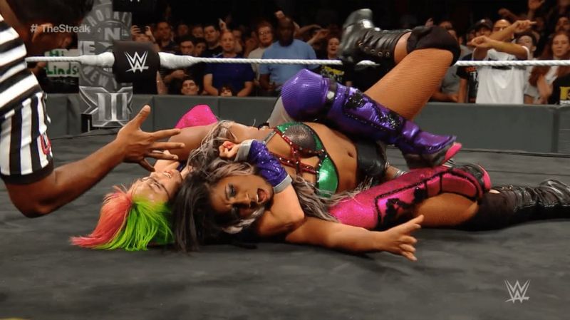 But Ember was determined, so instead of using her arms, she would use anything at her disposal. She would use her leg strength to reverse an Asuka Lock into a slam, or a roll-up, or just hit a lariat with her good arm. She even attempted to use Asuka's own finisher against her.