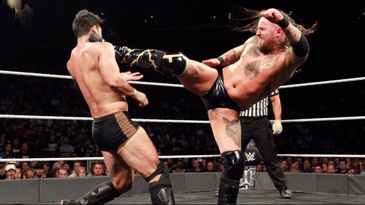 The action picked up when Gargano dived outside the ring and hit Almas with a slingshot DDT, only for a two count. When he went for a slingshot spear, Almas caught him and slammed him into the canvas, then hit a tornado from the top rope for a near-fall of his own.
