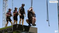 This weeks challenge is a thing where the teams have to swing across the ocean from platform to platform, about 50 feet up, using small ropes. The team captain of the winning team is safe and gets money for their charity (I forgot to mention they’re playing for charities of their choice, but to be fair, they almost forgot to mention it, too). They also get to pick someone from their team to go into Elimination. The losing team captain just automatically gets put into Elimination.