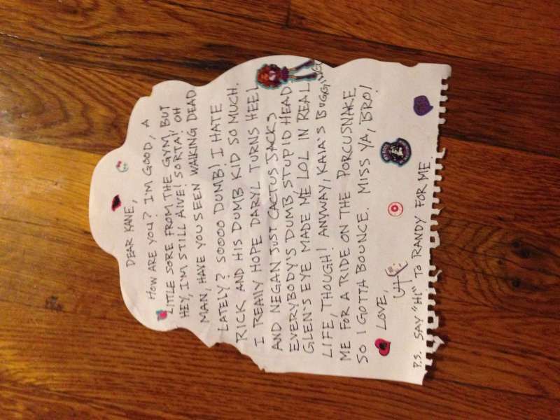“Dear Kane, How are you? I’m good, a little sore from the gym, but hey, I’m still alive! Sorta! Oh man, have you seen Walking Dead lately? Soooo dumb, I hate Rick and his dumb kid so much. I really hope Daryl turns heel and Negan just Cactus Jacks everybody’s dumb, stupid head.