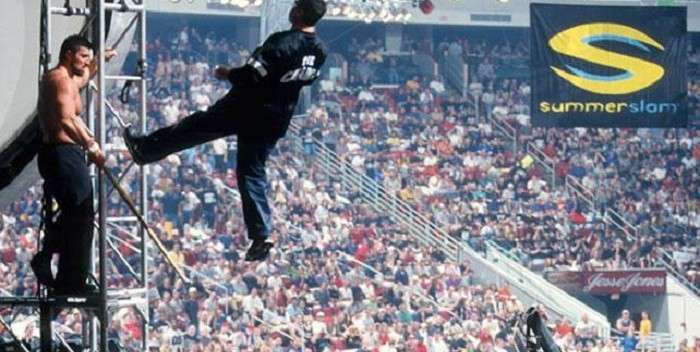 Yes, this just happened in April. Yes, Shane McMahon actually missed the Undertaker, which cost him the match essentially. But McMahon’s leap from the top of the cage during his Hell in a Cell match with the Undertaker at WrestleMania 32 deserves mentioning.