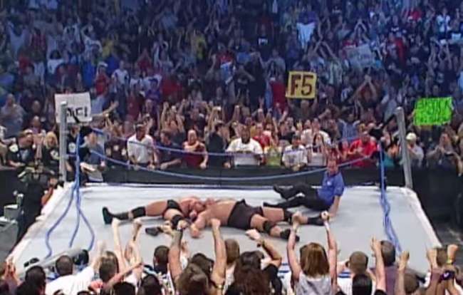 The two big men, whose total weight could be nearly 800 pounds depending on whom you believe in a given year, climbed to the top rope. Once there, Lesnar went for a superplex on Big Show that brought the men and the ring crashing down. Big Show has since admitted the spot was planned, but it’s still a memorable one.