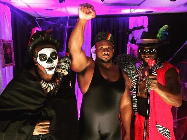 From left to right: Xavier Woods is dressed as Papa Shango (from the Golden Era), Big E is dressed as Kama Mustafa (from the early Attitude Era), and Kofi Kingston is dressed as The Godfather (from the Attitude Era peak).