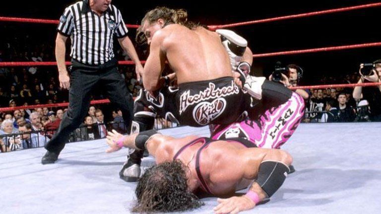 In the other match, Michaels locked in the Sharpshooter on Hart. Hart definitely didn't like the taste of his own medicine and tried to break it. He didn't tap out but the referee Earl Hebner went for the bell nonetheless.