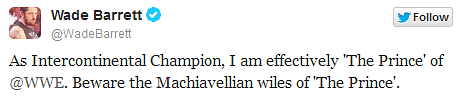 As the new Intercontinental Champion, Wade Barrett has given himself a new nickname. In a recent tweet, Wade declared himself as “The Prince” of WWE.