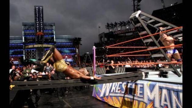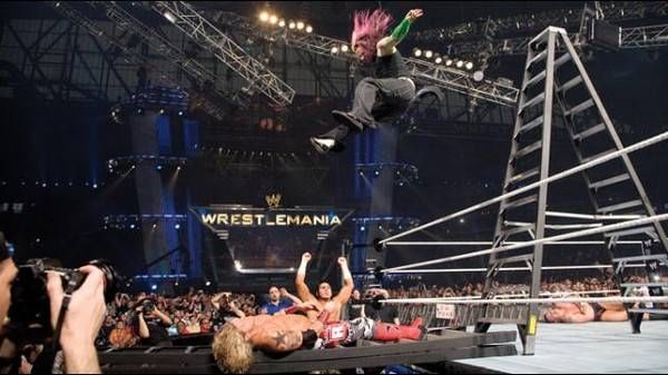 Another innovative performer to grace this match is John Morrison. Not even two minutes into the Wrestlemania XXIV edition of the contest and The Prince of Parkour has a ladder in hand and performs a moonsault off the top of the turnbuckle onto a crowd of other superstars.
