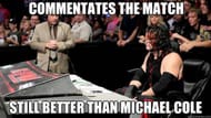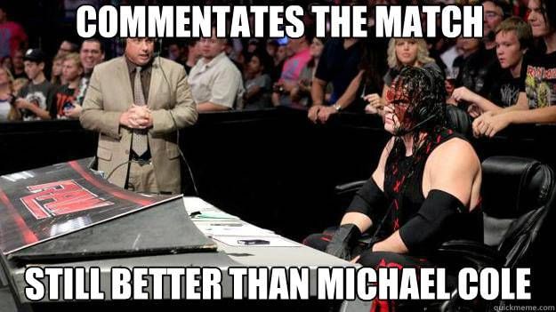 When a potentially classic moment is afoot, instead of solidifying its impetus, JBL and Michael Cole end up mouthing off two different words at the exactly same time.They even manage to do it at the exact same instant sometimes, almost with metronomic coincidence. Once this happens, you’re already thrown off as a viewer, and what could have been an iconic moment gets recycled into a non-event by the time they make eye contact and sort out their feet regarding who is supposed to say something.