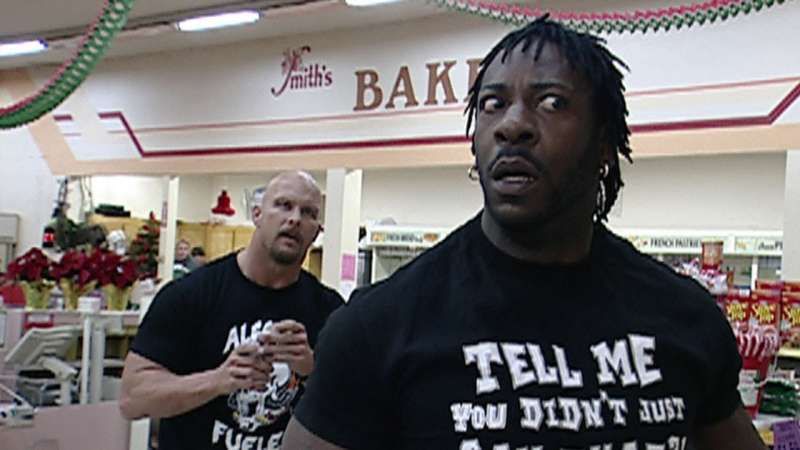 One of the single funniest moments of the early “Brand Split” days was this. Having stuck his nose in Stone Cold’s business once too many times, Steve decided to track Booker T to the local supermarket.