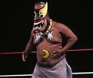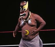 Kamala perfected the African mountain man gimmick, with the leopard-spotted loin cloth, face paint and adorning his upper body with two white stars and a yellow crescent moon. He wrestled barefoot to complete the look of the Ugandan giant.