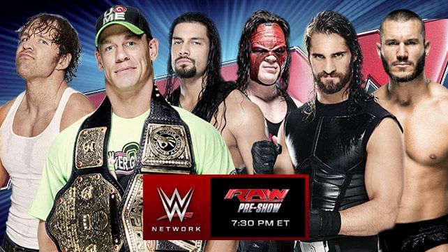 Cena and Roman taunted each other, as Ambrose was shown on the titantron. Ambrose talked about putting their differences aside for one night, and take out Rollins, Orton and Kane, as the trio surrounded Dean. The three superstars beat Dean down, ramming him against the wall and kicking him. Dean was busted open near his mouth, and asked if that was all they had. Rollins nailed the double foot stomp on Dean, as the medical personnel tended to him. The main event was then changed to a handicap match between Cena and Roman against Orton, Kane and Rollins.