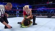 Alexa tries to fight back but is met with a jawbreaker. Alexa then hits Naomi, who was on the apron, with a kick and she drops on the mat.