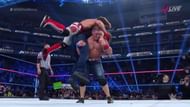 Cena and Styles then lock each other into Sleeper Holds one after the other. After some more back and forth, Cena tries to go for the Five Knuckle Shuffle on Ambrose but Styles interferes and nails a German Suplex instead.