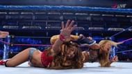 Chants of “We want Becky” ring around the arena. Alexa then tries to work on Naomi’s arm but she counters with a dropkick before nailing the rearview for a nearfall.