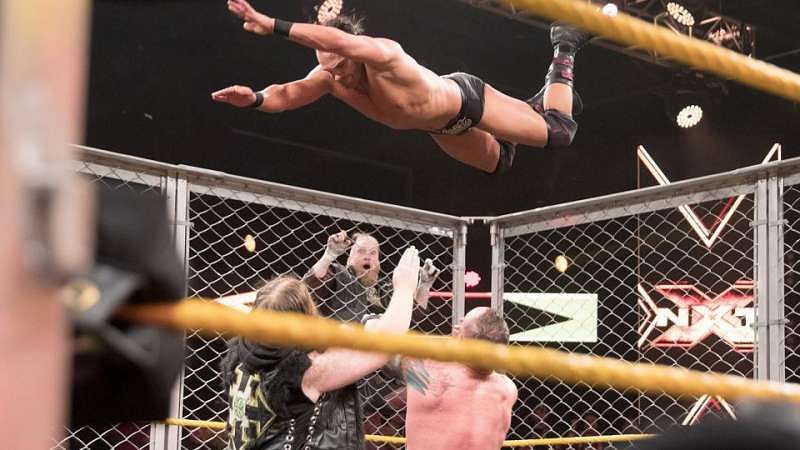 The cage door was opened as Dillinger looked to escape the cage. The rest of SAnitY came out at this point and locked Dillinger in. Roderick Strong, Kassius Ohno and Ruby Riot came out as they brawled outside the ring.