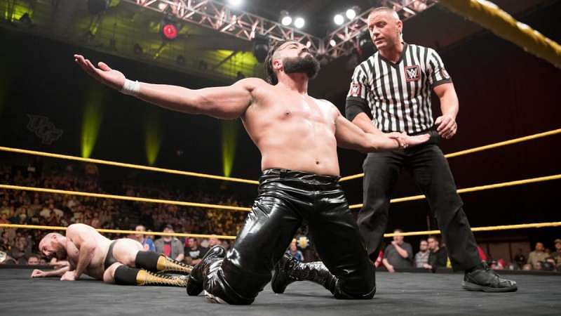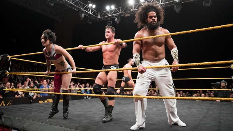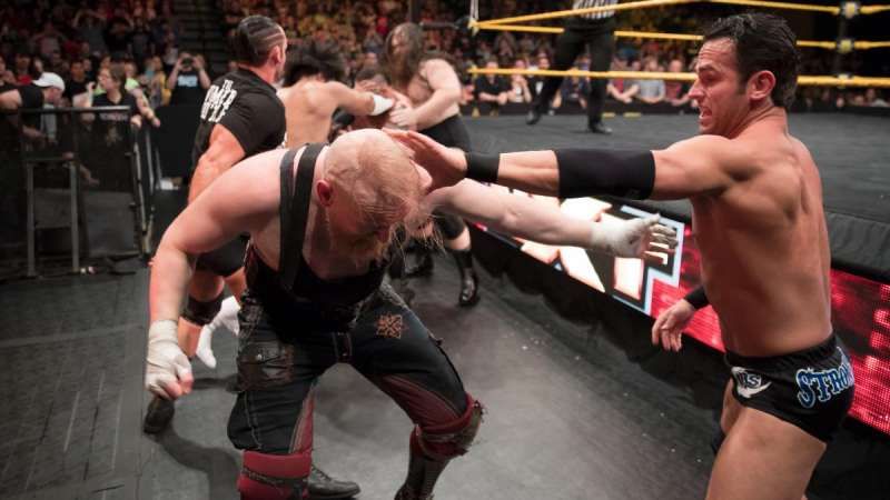This feud has been brewing for a while on NXT. Matters came to head tonight with a 3 on 3 tag-team match between Eric Young, Killian Dain and Alexander Wolfe taking on Tye Dillinger, No Way Jose and Roderick Strong. The action started even before the bell rang as the babyfaces dragged Wolfe and Young to ringside and started landing blows on them. The match finally started with Dain and Strong in the middle of the ring.