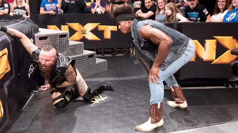 Black was in the middle of his entrance when Velveteen Dream attack him from behind and flung him into the steel steps. Dream then tied Black up in the ropes and screamed at him to say his name. Black replied with a kick to the head of Dream before freeing himself. He then looked to hit the Black Mass but it missed Dream who slinked away.