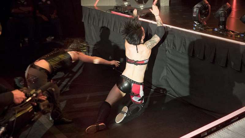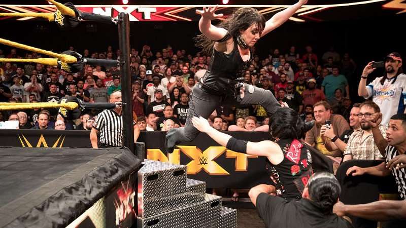 Nikki Cross charged at Ruby Riot as the two women rolled out to ringside. Cross sent Ruby Riot face-first into the steel steps as referees came out to separate the two women. Cross got up on the steep steps and jumped onto Ruby Riot and the referees trying to separate them.
