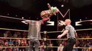 Asuka drove the trash can into Cross’ gut before putting it can over Cross’ head and hitting her with a number of kicks. As Cross lay on her knees, the trash can still lodged over her upper body, Asuka hit her with a missile dropkick.