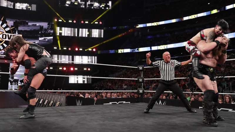 At one point, Roderick Strong went head to head with Killian Dain, only to be met with Nikki Cross on his back. This led to Ruby Riot doing the same. She played the equaliser, and the two women eventually went at each other. Strong was pulled from under and taken out by Eric Young, while Ruby Riot took out Nikki Cross with a drop kick outside.