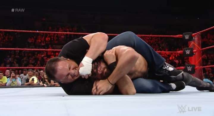 Samoa Joe is under the pump, having just managed to survive a couple of near finishes against a rampant Seth Rollins. The Kingslayer even unearths his new finishing move in an attempt to put the Samoan to the proverbial sword...but to no avail.