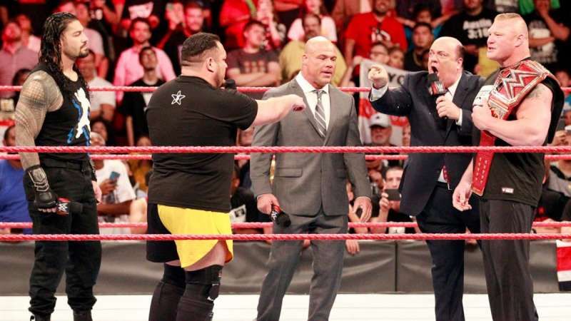 Kurt Angle said he wanted Heyman and Lesnar to hear what he had in mind for Lesnar’s Summerslam opponent. Heyman said that it didn’t work that way and decided to leave. Roman Reigns then came out