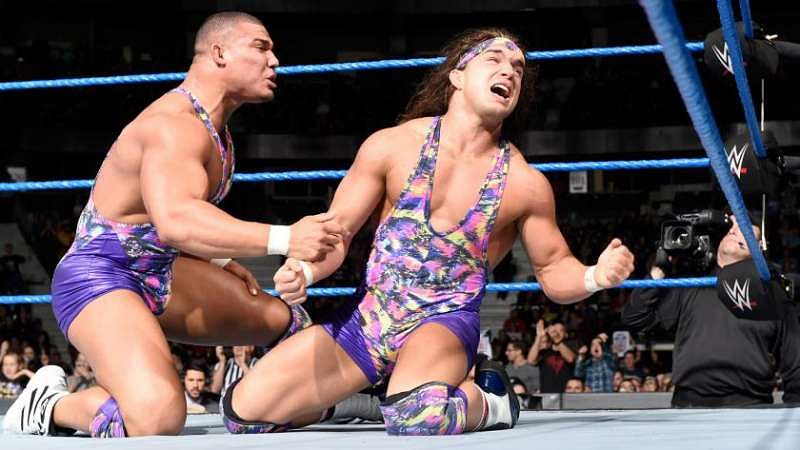 The Vaudevillains run in for their chance to contend for the Tag-Team Championships but Jason Jordan immediately hits a pinning German Suplex on Aiden English to eliminate the Vaudevillians.