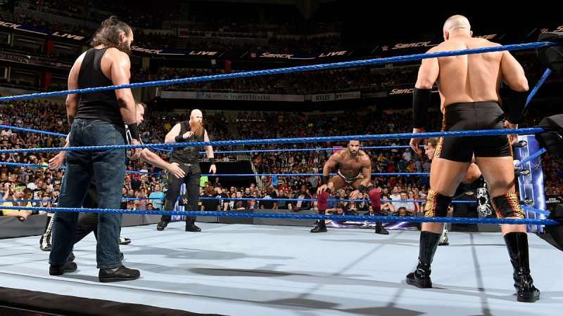 Rowan threw Ziggler onto everyone outside. Jinder was the closest to getting the pinfall, with a near fall on Ziggler, which was broken up by Zayn. Rowan was nearly pinned after a Zig-Zag by Ziggler, but he kicked out. Inside the ring, Sami Zayn was ready to finish off Jinder with the Helluva kick, but his legs were held back by the Bollywood Boyz, who made their debut. Jinder unexpectedly finished Zayn to become the #1 contender. It seems like Jinder and The Bollywood Boyz have formed a new stable.