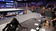 Outside the ring, Tamina started clearing the announcer’s desk and took Charlotte, who shoved her into the ring apron and subsequently the post. She then suplexed Charlotte on the floor. Charlotte then went to the ring post and hit her picture perfect Moonsault onto Natalya and Tamina. As she turned around, Carmella jumped on her from the barricade.