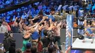 The rest of the women on Raw came out at this point, dressed in red Raw shirts themselves, to help Charlotte out. Sasha Banks, Alicia Fox, Dana Brooke and Nia Jax all came into the ring to the aid of Charlotte. Carmella tried to help fight the Raw women off of a downed Nikki but failed.
