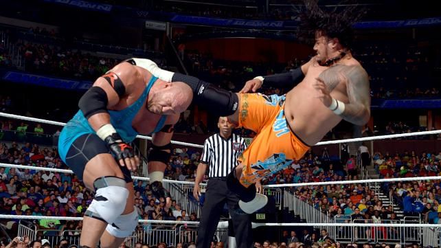 Smackdown opened with tag-team action as Rybaxel were up against Tag-Team champions The Usos. Fresh from a much needed victory against Kofi Kingston and Big E on last Monday Night Raw, Ryback and Axel looked to take a step ahead into becoming the next title contenders to The Usos belts who themselves were brimming with confidence from the 2-out-of-3 falls victory over Luke Harper and Eric Rowan at Battleground.
