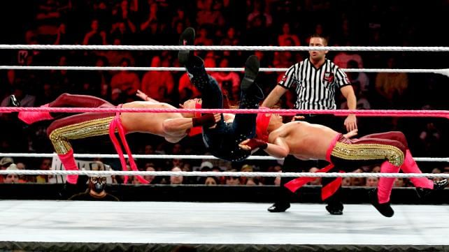 Diego takes McIntyre down with a springboard cross-body. Fernando tags in as Diego elbows McIntyre. Fernando jumps over McIntyre and grabs him. They then drop McIntyre with a double-team reverse STO for the win.