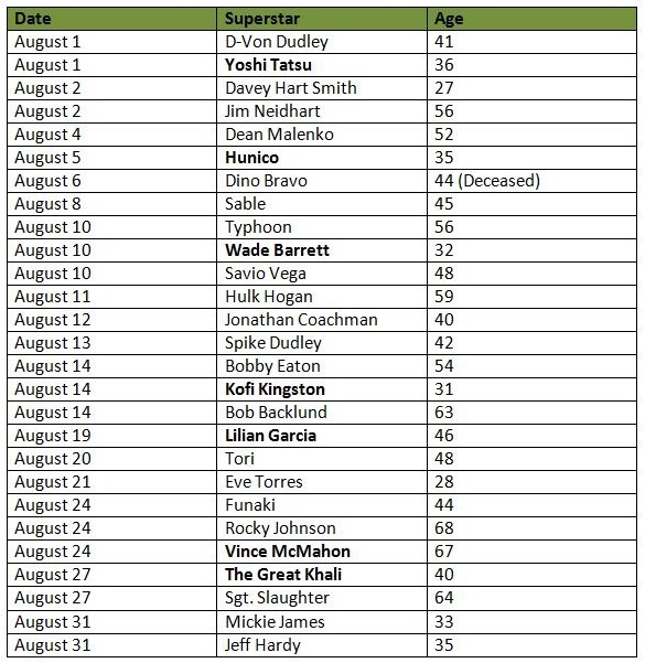 Notable birthdays for the month of August feature the likes of ‘The Boss’ Mr McMahon, the ‘Immortal’ Hulk Hogan, tag team specialists D-Von Dudley and Jeff Hardy, and notable divas like Sable and Eve Torres amongst others.
